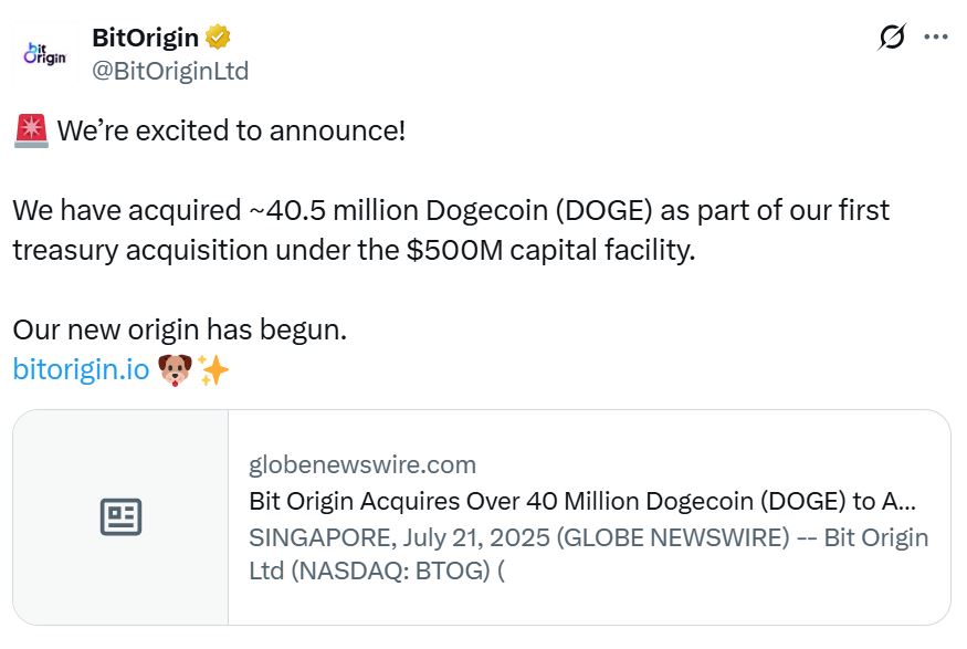 17 июля Bit Origin заключил соглашения с инвесторами о продаже до 400 миллионов долларов акций и до 100 миллионов долларов в виде конвертируемого долга для финансирования стратегии казначейства Dogecoin.