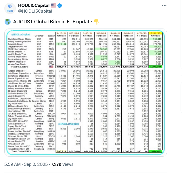 Global Bitcoin ETPS добавили более 170 000 BTC на сумму около 18,7 млрд. Долл. США, в период с 31 декабря 2024 года и 31 августа 2025 года.