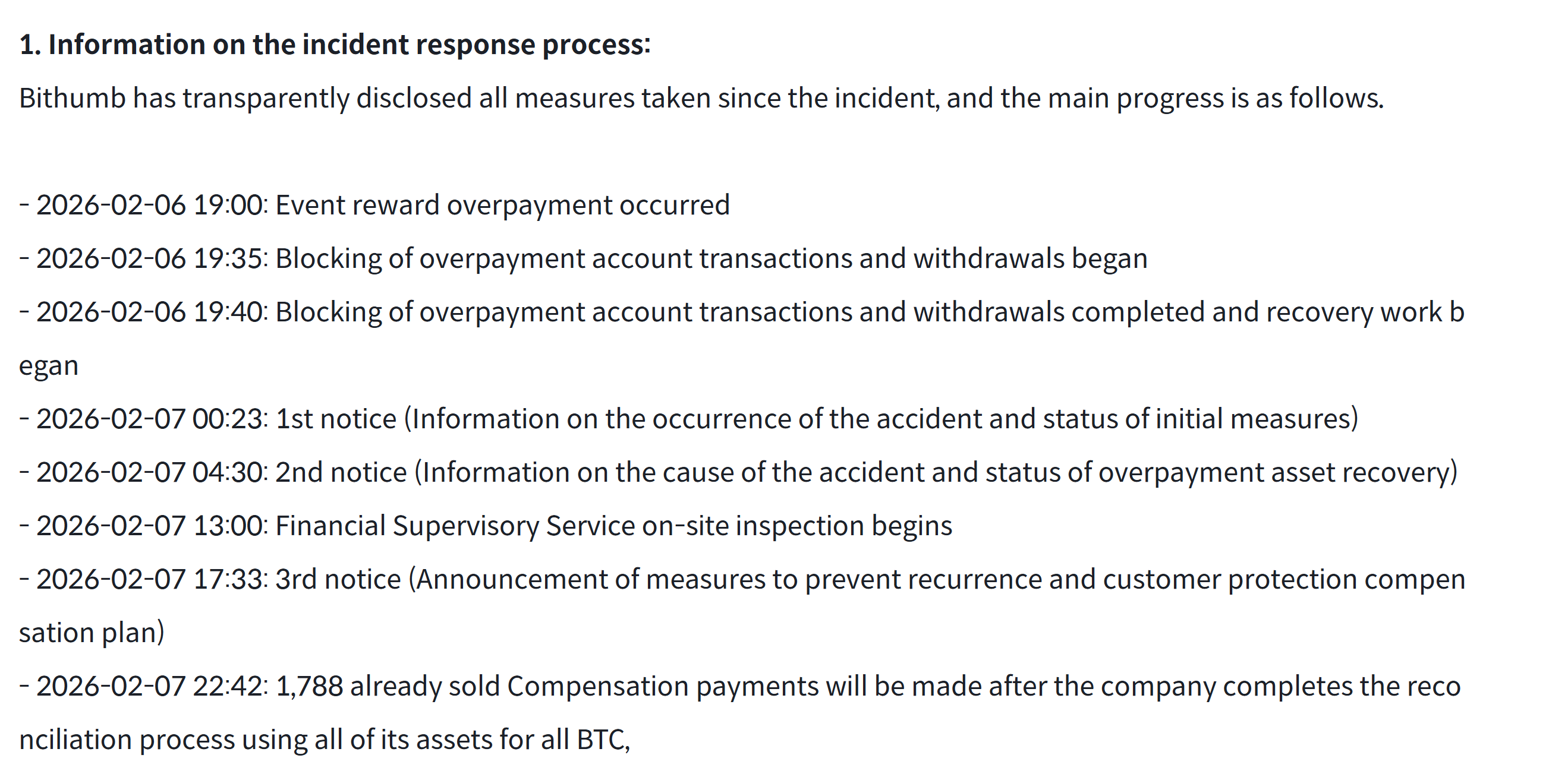 Биржа заявила, что инцидент не был связан со взломом и что никакие активы клиентов не были потеряны, а депозиты и снятие средств продолжаются в обычном режиме. Хотя компания не раскрыла общую сумму, некоторые пользователи утверждали, что было зачислено около 2000 BTC.