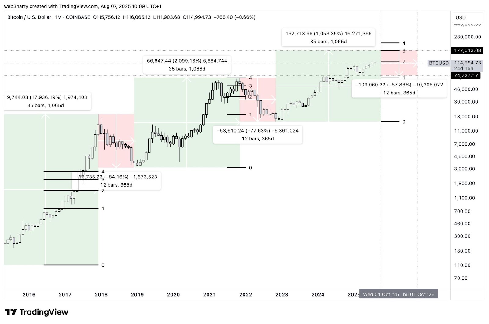 В течение последних трех рыночных циклов биткоин Price Peak наступил в год, который следует за вдвое, а именно в 2013, 2017, 2021 году, и теперь снова после четырех лет спустя в 2025 году.