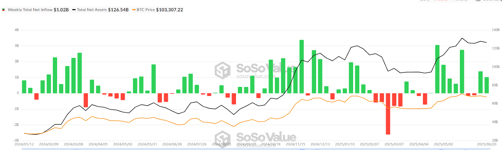 Данные Sosovalue показывают, что фонды Биткоин, выпущенные Биткоин, выпущенные фондами Биткоин (ETFS), несмотря на геополитические проблемы, накопив более 1 миллиард долларов кумулятивного чистого притока за прошедшую неделю.