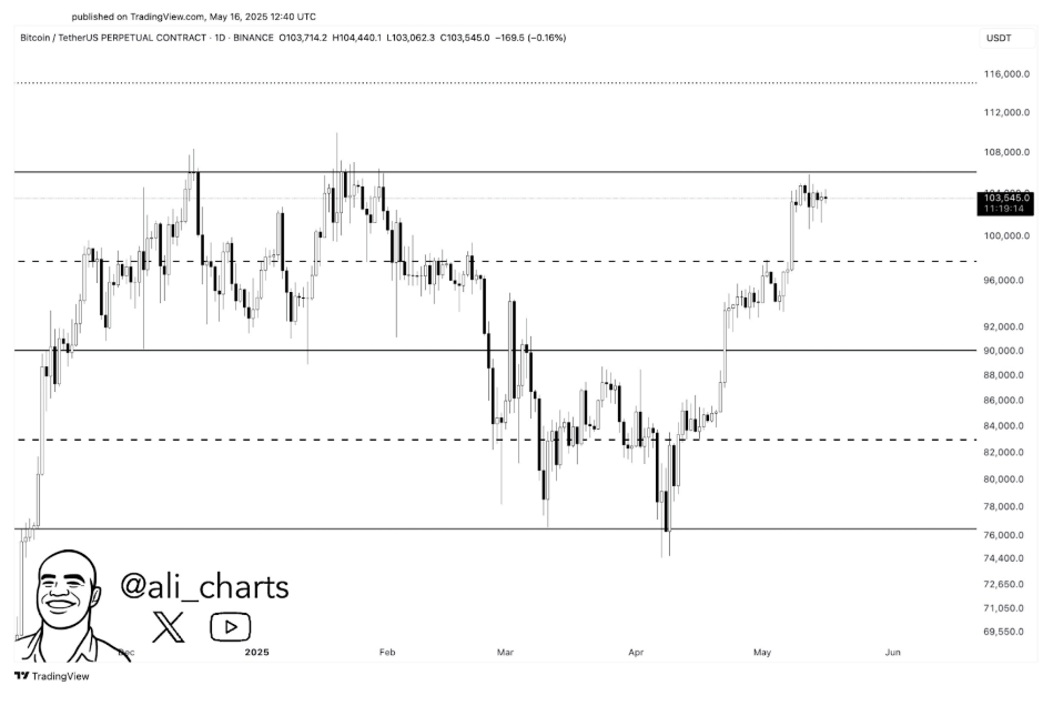 Текущая консолидация Биткоина около уровня цены в размере 103 000 долл. США затянулась в течение более недели, и возможный прорыв может произойти в любом направлении. В недавнем посте о платформе социальных сетей X аналитик криптовалют Али Мартинес отметил важность ежедневного закрытия выше 107 000 долларов для бычьего биткоина.
