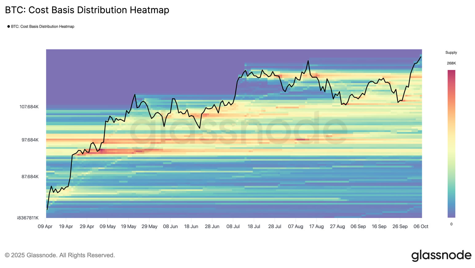 Glassnode использовал «тепловую карту распределения затрат», чтобы подчеркнуть структурную поддержку, отметив, что она была ограничена между 121 000 и 120 000 долларов США и выше около 117 000 долларов США, где в последний раз было приобретено примерно 190 000 BTC.