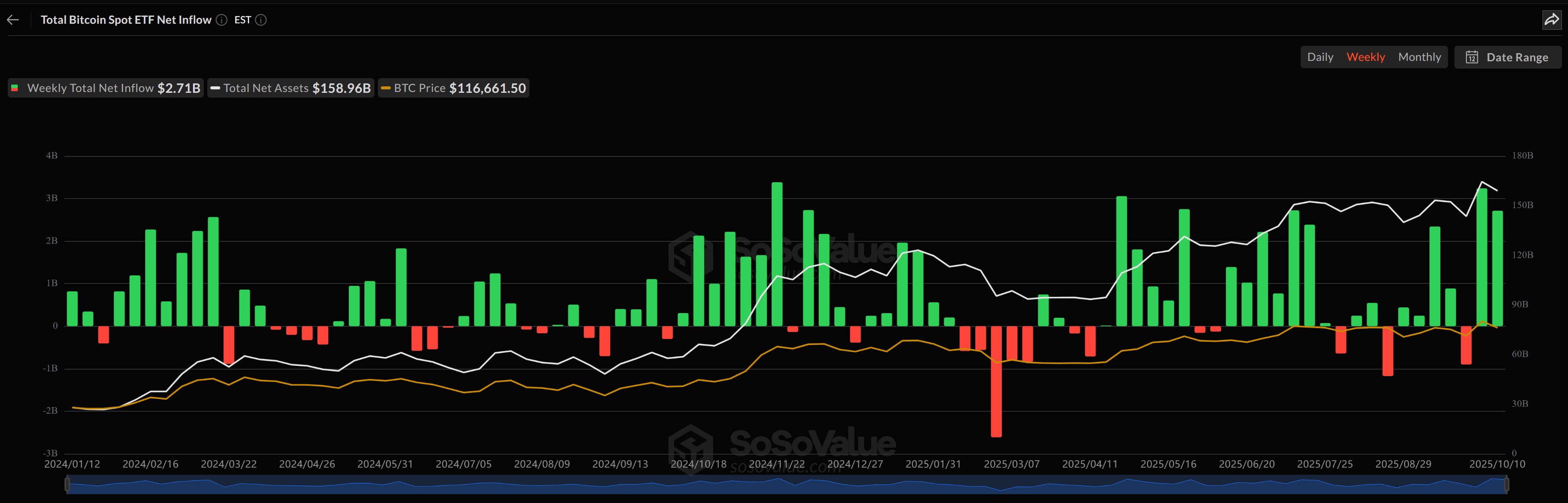 Американские спотовые биржевые фонды Биткоин (ETF) продолжили показывать хорошие результаты «Uptober» с еженедельным притоком в $2,71 млрд, что ознаменовало еще одну сильную неделю для институционального спроса.