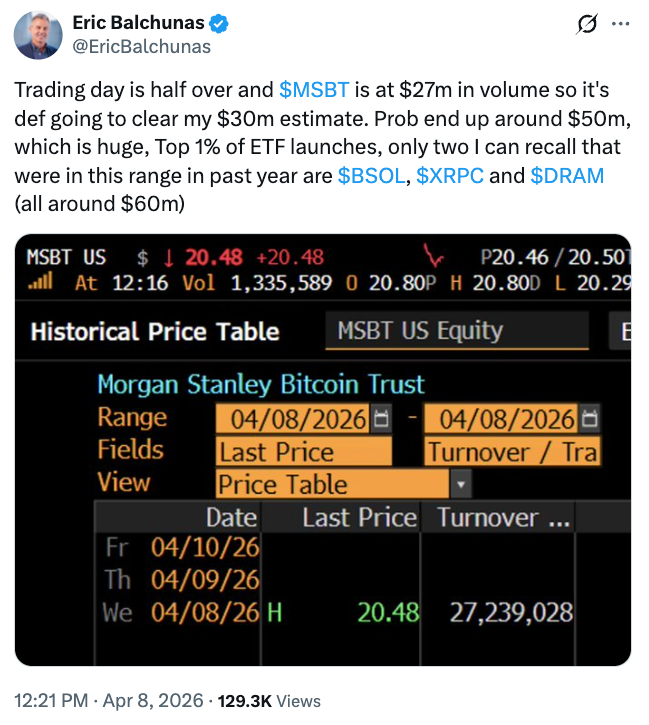 MSBT начал торги на NYSE Arca в среду, принеся объем торгов в размере 34 миллионов долларов, что немного превышает ожидания аналитика Bloomberg ETF Эрика Балчунаса, который предсказал, что объем торгов в первый день достигнет 30 миллионов долларов.