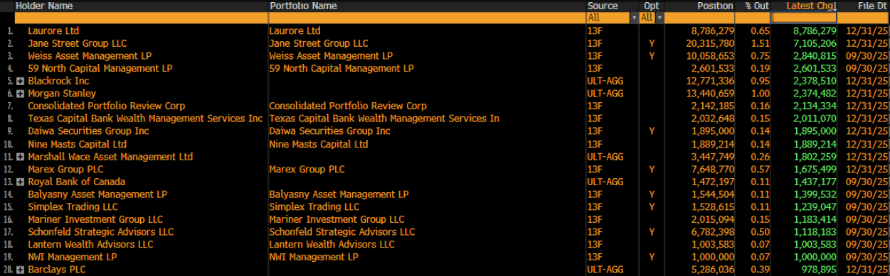 Помимо Laurore и Jane Street, несколько организаций сделали значительные шаги с помощью IBIT в четвертом квартале 2025 года. Сообщается, что Weiss Asset Management добавила примерно 2,8 миллиона акций (107,5 миллиона долларов), а 59 North Capital увеличила свои позиции на 2,6 миллиона акций (99,8 миллиона долларов).