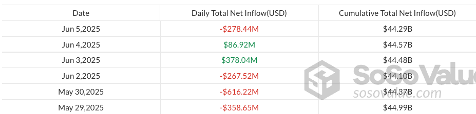 После краткого восстановления ETF 3 и 4 июня ETF в четверг в четверг, на общей сложности 278 миллионов долларов США, на общую сумму 278 миллионов долларов.