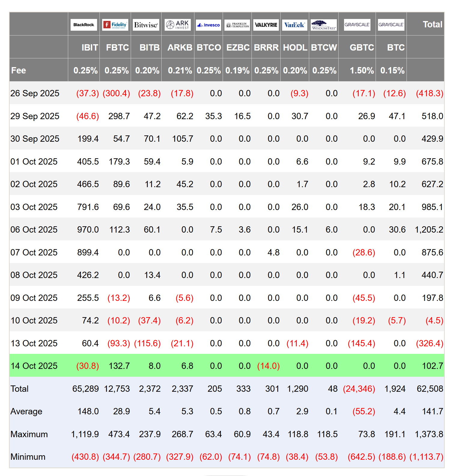 По данным SoSoValue, чистый приток спотовых биткоин-ETF (BTC) составил $102,58 млн, восстановившись после оттока в $326 млн всего днем ранее. Биткоин-фонд Fidelity Wise Origin (FBTC) лидировал с притоком в 132,67 миллиона долларов, в то время как iShares Bitcoin Trust (IBIT) BlackRock сообщил о скромном оттоке в 30,79 миллиона долларов.