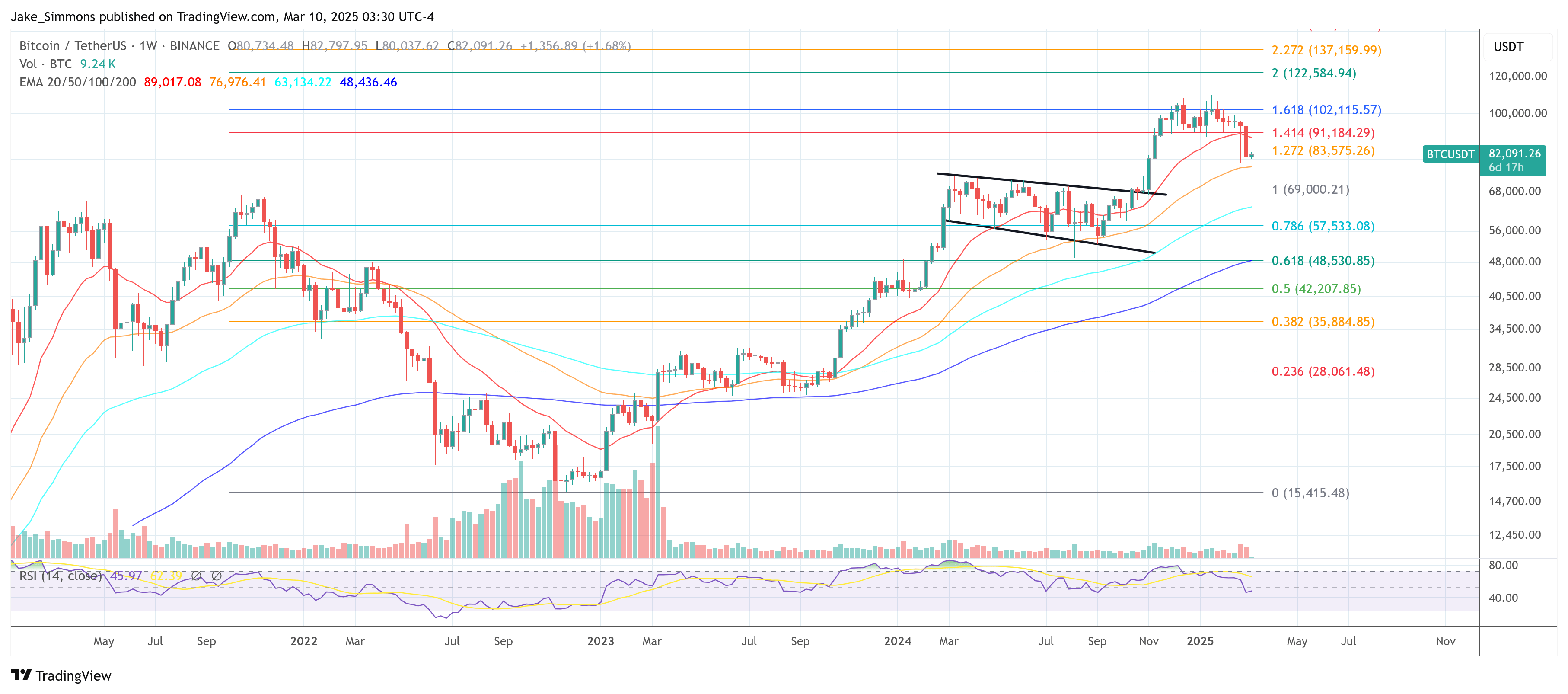 Цена Биткоина пережила еще один приступ волатильности в выходные дни, пролив 5% в воскресенье, чтобы опуститься ниже отметки в 80 000 долларов, прежде чем заселить около 82 000 долларов. Это последнее снижение ставит криптовалюту примерно на 25% ниже своей рекордной максимума в 109 900 долларов. Аналитики приписывают спад постоянной торговой напряженности, привязанной к последним тарифным мерам президента Дональда Трампа, и опасениями над надвигающейся рецессией.