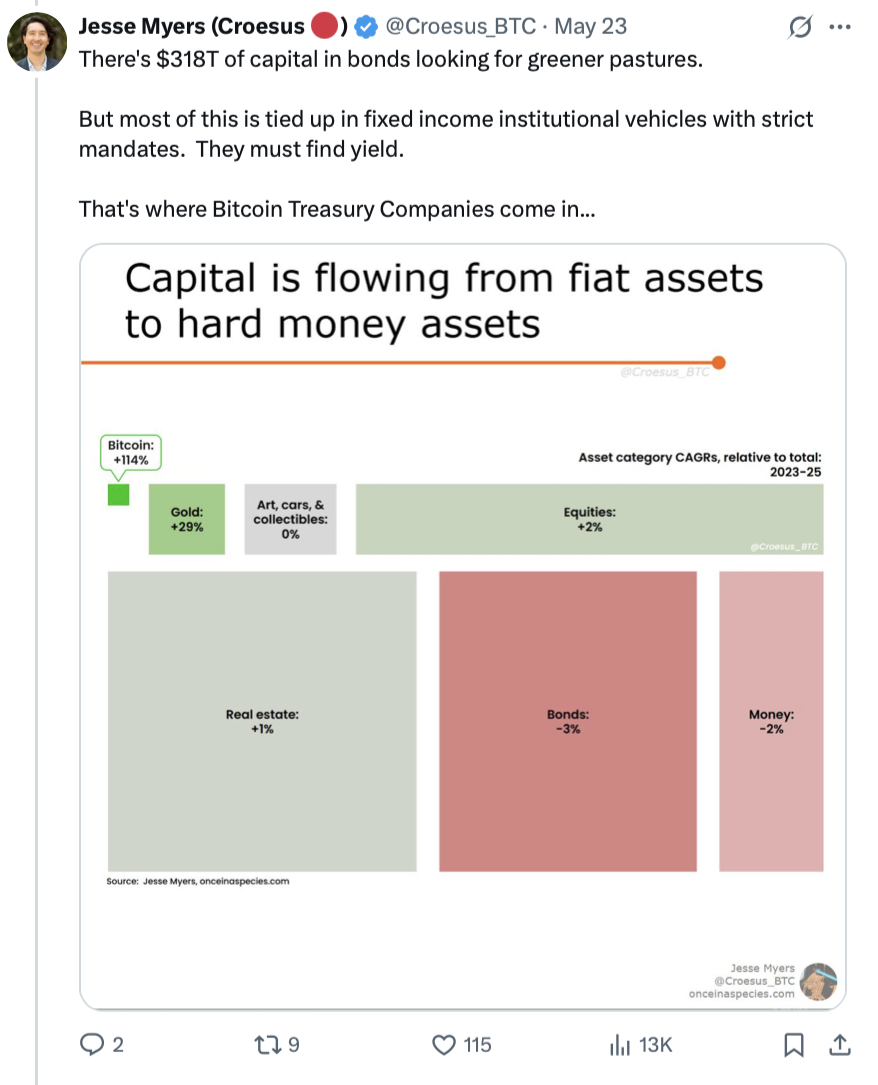 «Биткоин -казначейские компании проведут 50% всех BTC, к чему готовы большинство биткоинеров», – сказал Джесси Майерс в ветке 23 мая.