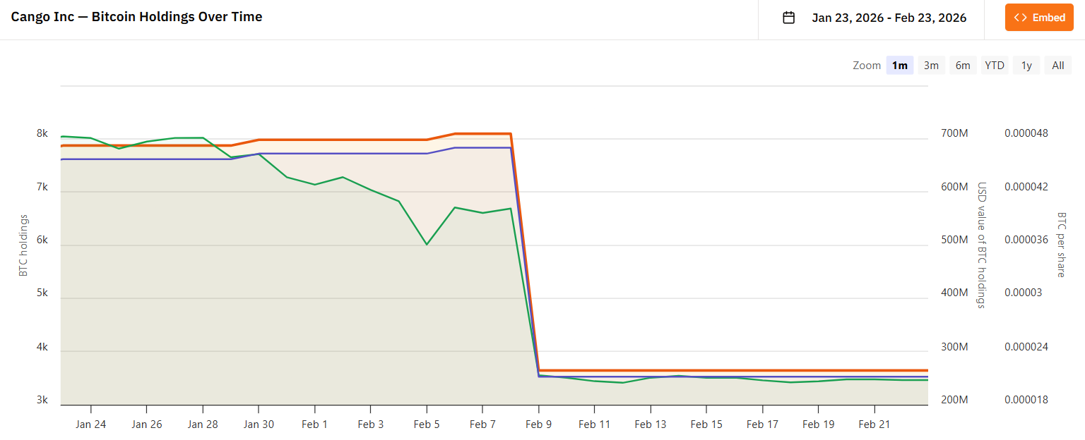 Китайская публичная компания Cango, 27-й по величине держатель, сократила свои запасы Биткоин более чем на 54% за последние две недели: с 8 095 BTC 8 февраля до 3 644 BTC на сумму 246 миллионов долларов по состоянию на понедельник.