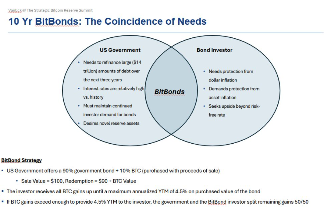 Мэтью Сигел представил концепцию «Битбондов» – казначейских облигаций США с воздействием Биткоин (BTC) – на Стратегическом саме Bitcoin Reserve 2025 15 апреля.