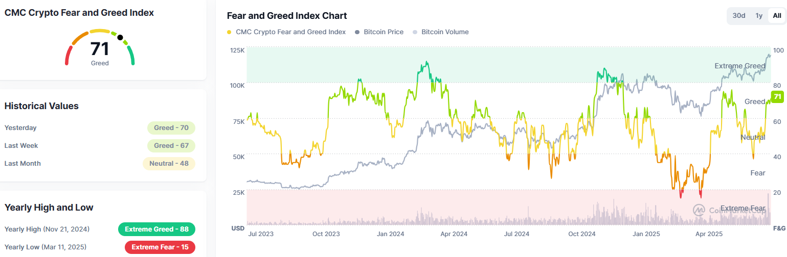 «Мы видим индикаторы страха/жадности на 73, что указывает на некоторую жадность, но, вероятно, многие все еще не полностью выделены и ожидают, по крайней мере, некоторых рыночных беспорядков или откатов».