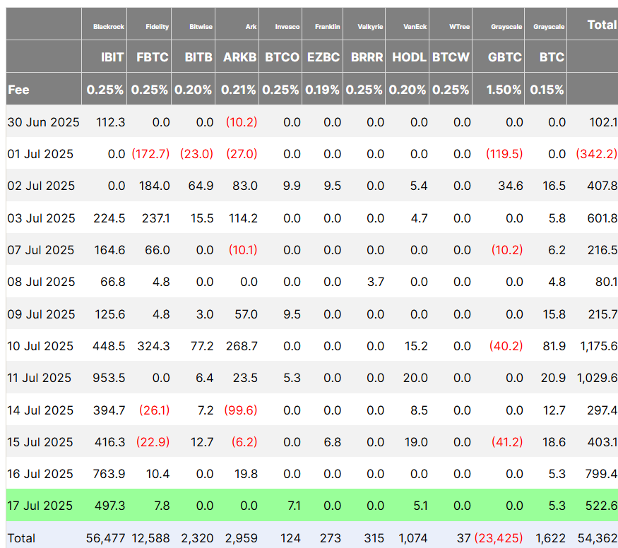 Между тем, фонды Биткоин, пройденных в США, зарегистрировали 11-й день подряд чистого положительного притока, накопив инвестиции на сумму более 522 миллионов долларов в четверг, показывают данные Farside Investors.