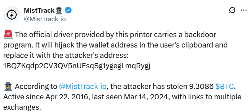 «Официальный драйвер, предоставленный этим принтером, несет в себе программу Backdoor. Он угнает адрес кошелька в буфер обмена пользователя и заменит его на адрес злоумышленника».