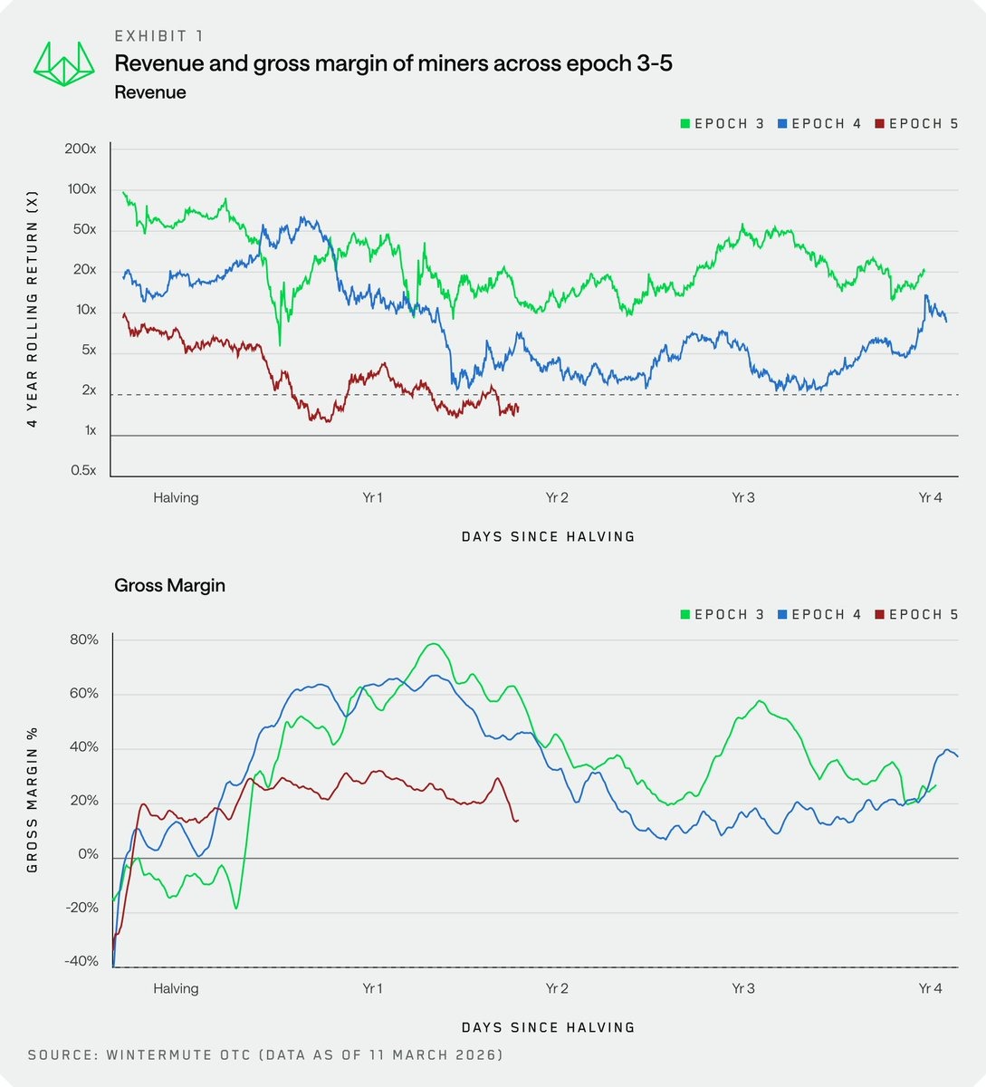 Уинтермьют заявил, что впервые за четырехлетний рыночный цикл Биткоин не смог обеспечить двукратный возврат цен, необходимый для компенсации сокращения доходов, вызванного сокращением вдвое, а валовая прибыль достигла пика на уровнях, которые ранее отмечали минимумы медвежьего рынка.
