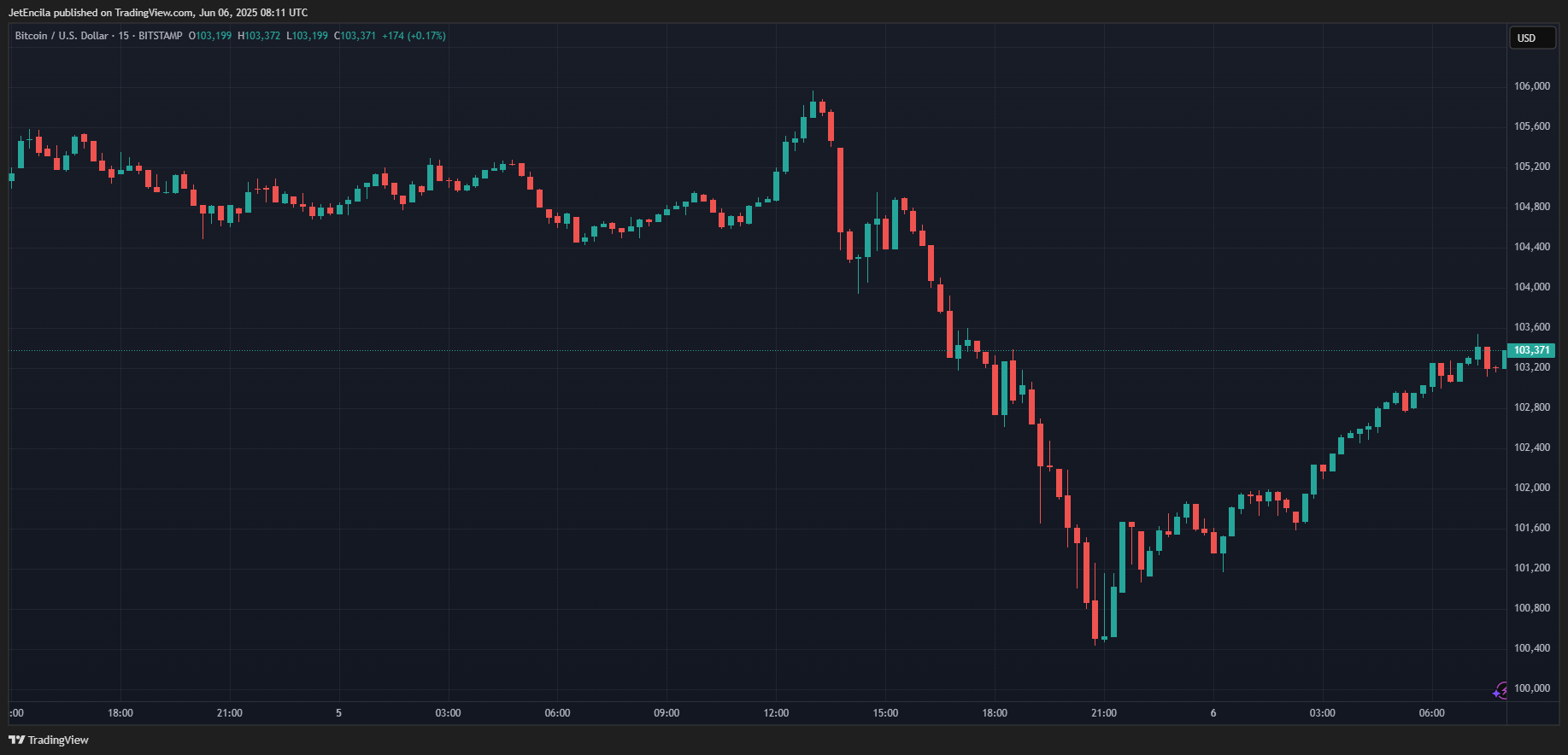 BTC в настоящее время торгуется на уровне 103 371 долл. США. Диаграмма: Tradingview
