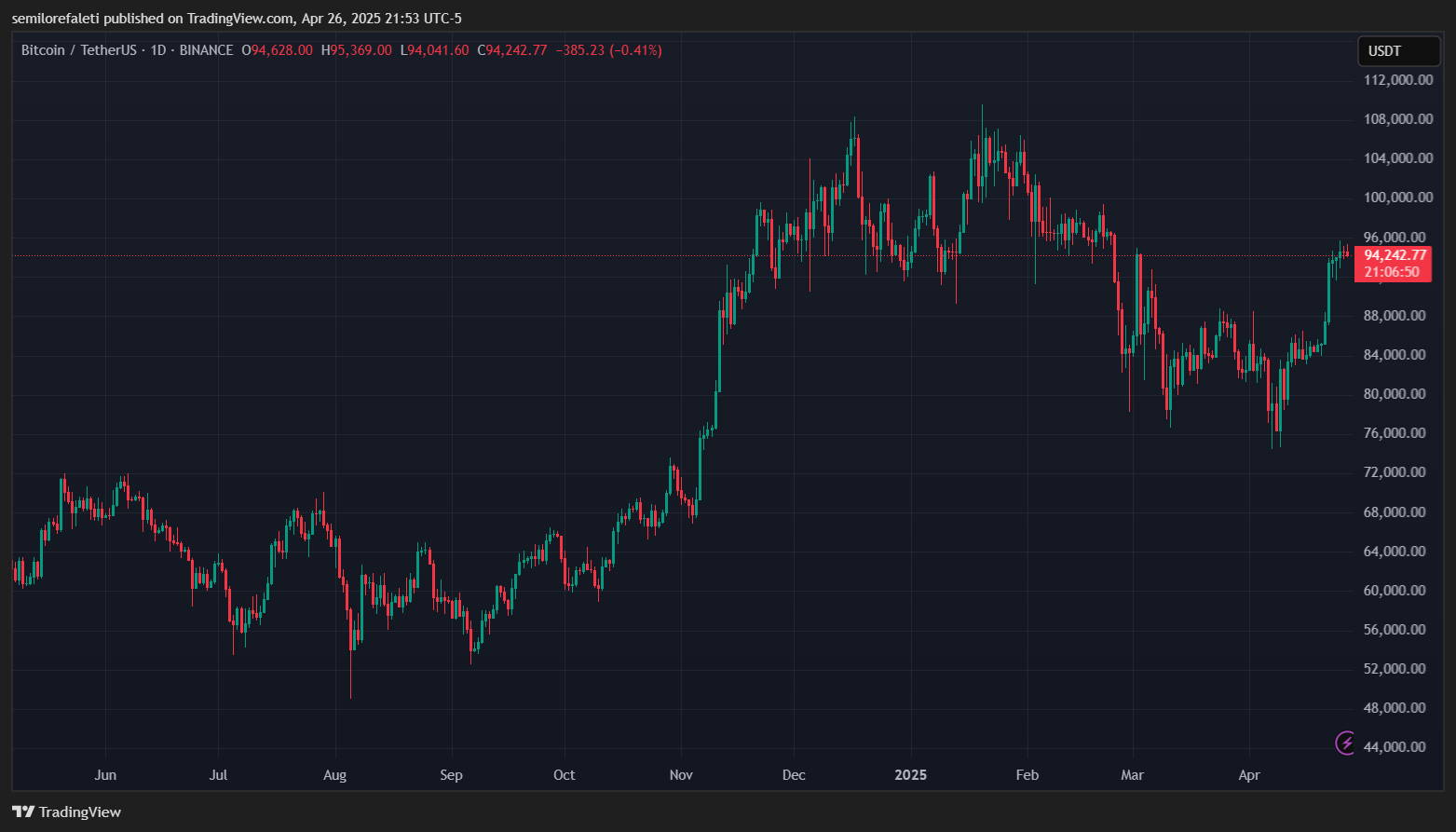 BTC Trading по цене $94 242 на ежедневной диаграмме |Источник: диаграмма BTCUSDT на TradingView.com