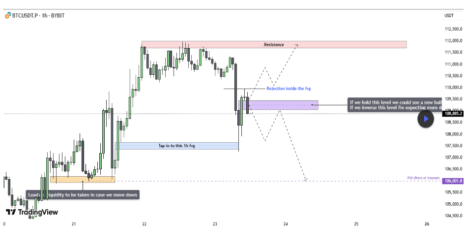 По словам аналитика криптовалюты Tehthomas, текущая структура цен Биткоина определяется двумя противоположными пробелами справедливой стоимости 1-часовой стоимости (FVGS). Нижняя зона FVG, идентифицированная аналитиком, составляет около 107 500 долл. США, что появилось во время ралли к 111 814 долл. США ATH и в настоящее время выступает в качестве первой значимой точки реакции после-роли.