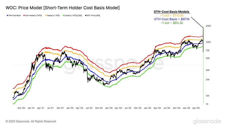 Согласно данным GlassNode, текущая основа стоимости Биткоин STH оценивается в 97 100 долл. США. Используя стандартные полосы отклонения в этой модели WOC, GlassNode далее определил уровень цен в 114 800 долл. США как +1 -й уровень этой основы затрат и потенциально нагретая рыночная зона.