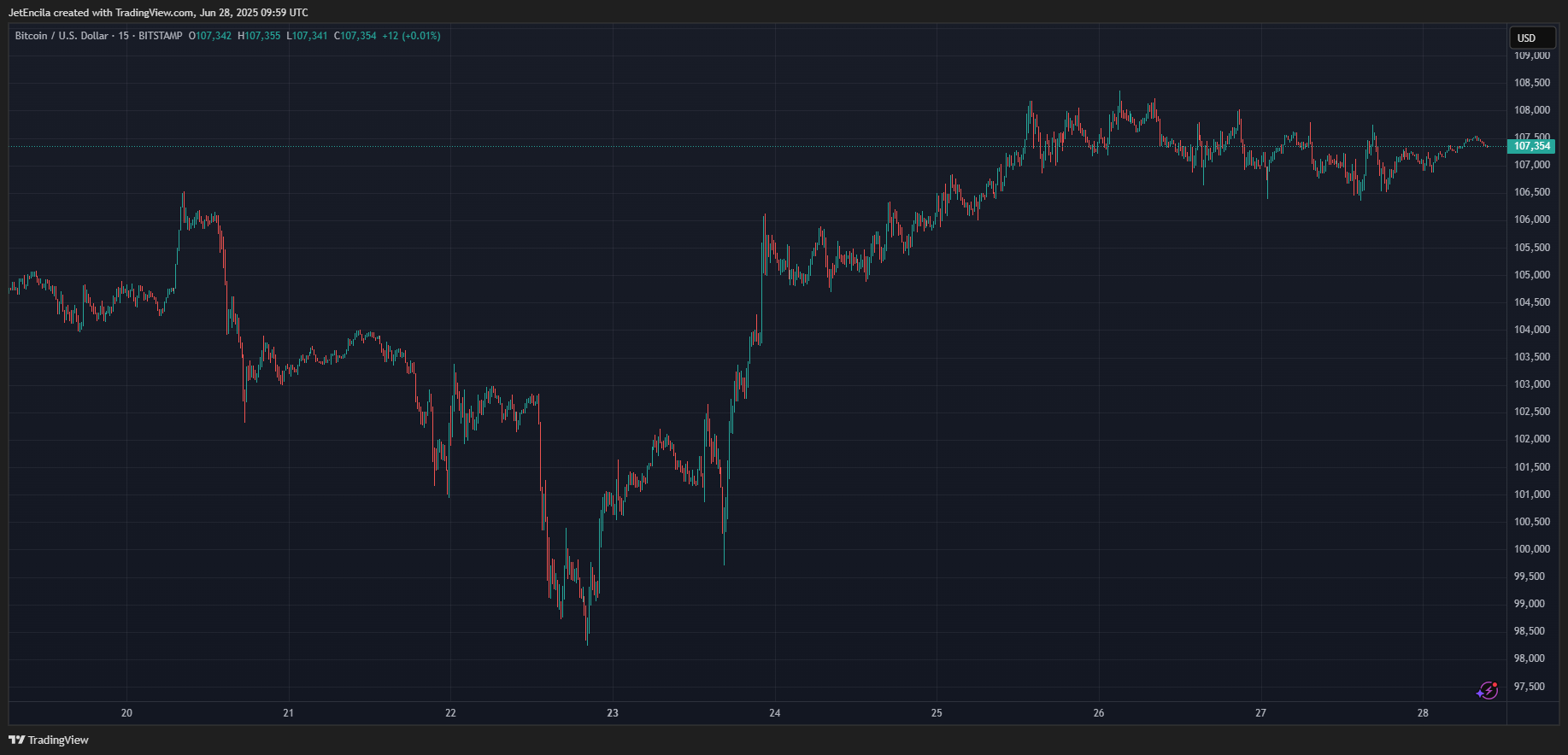 BTC в настоящее время торгуется на уровне 107 354 долл. США. Диаграмма: Tradingview