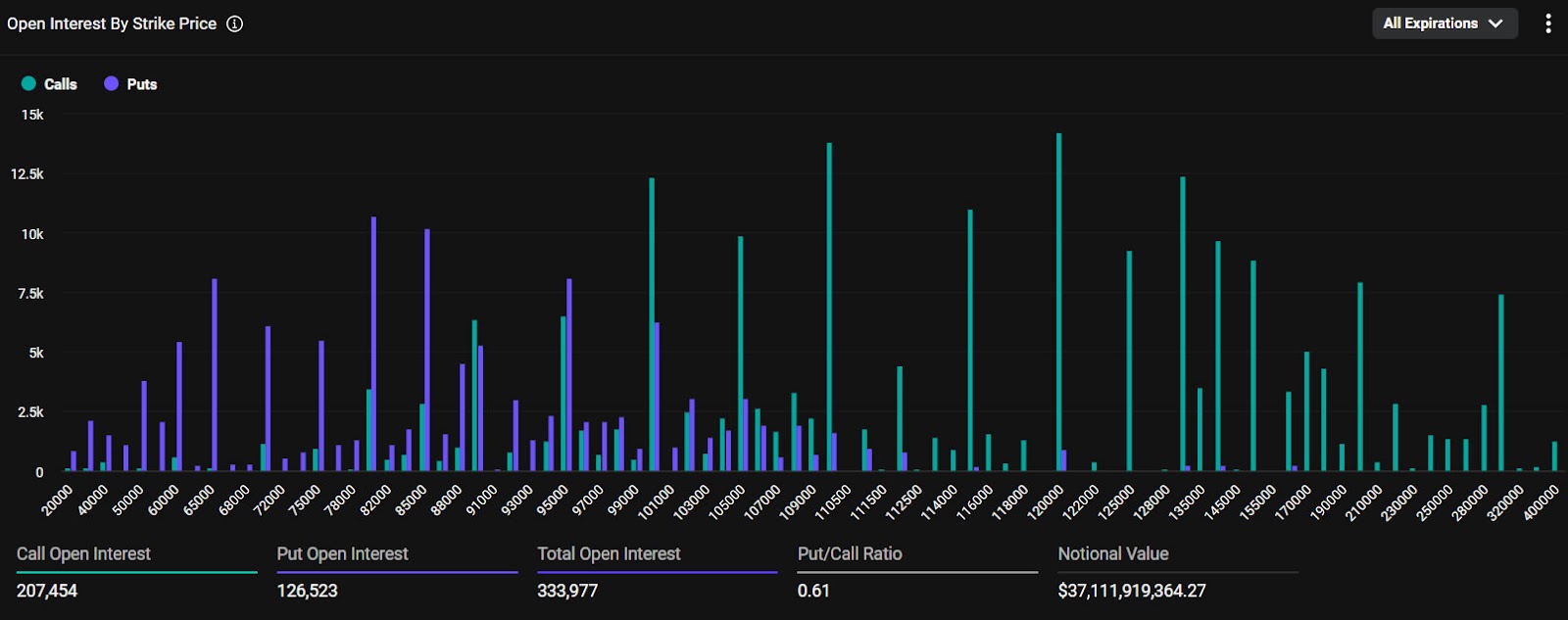 Рынки Биткоин Опционы показывают аналогичную схему с открытой процентом более 1,5 млрд. Долл. США по ценам удара в размере 110 000 долл. США и 120 000 долл. США на бирже производных. Также в размере 1 млрд. Долл. США по ценам на забастовку в размере 115 000 долл. США, 125 000 долл. США и 130 000 долл. США.