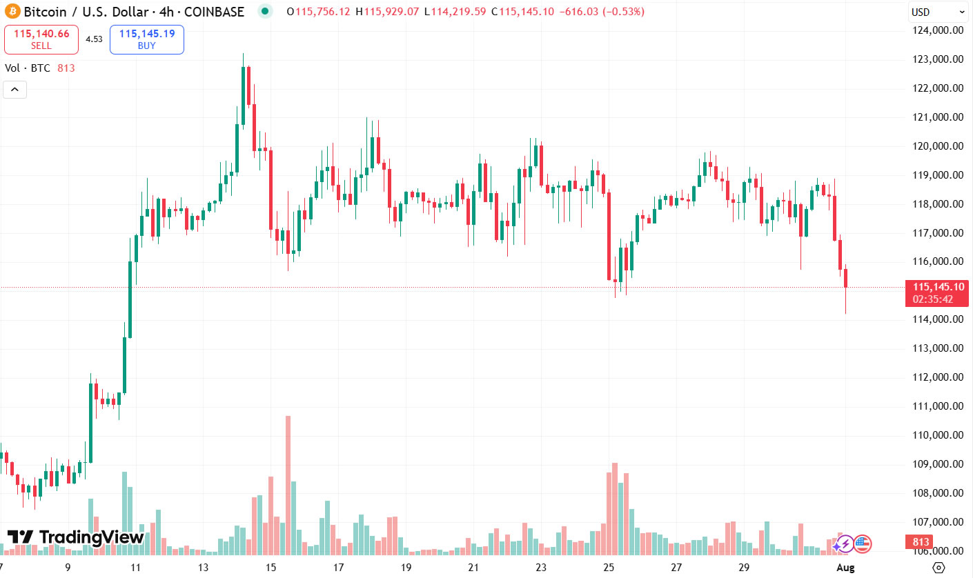 Биткоин (BTC) упал до 114 250 долларов на Coinbase во время ранней торговли в Азии в пятницу, сообщает Tradingview. Это было не так низко с 11 июня.