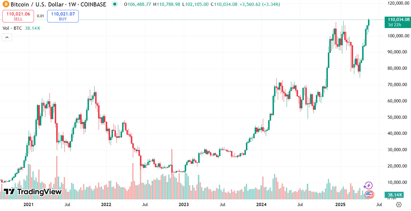 Биткоин (BTC) достиг нового рекордно высокого уровня в 110 788,98 долл. США на Coinbase поздно 21 мая, незадолго до 23:30 UTC, согласно Tradingview.