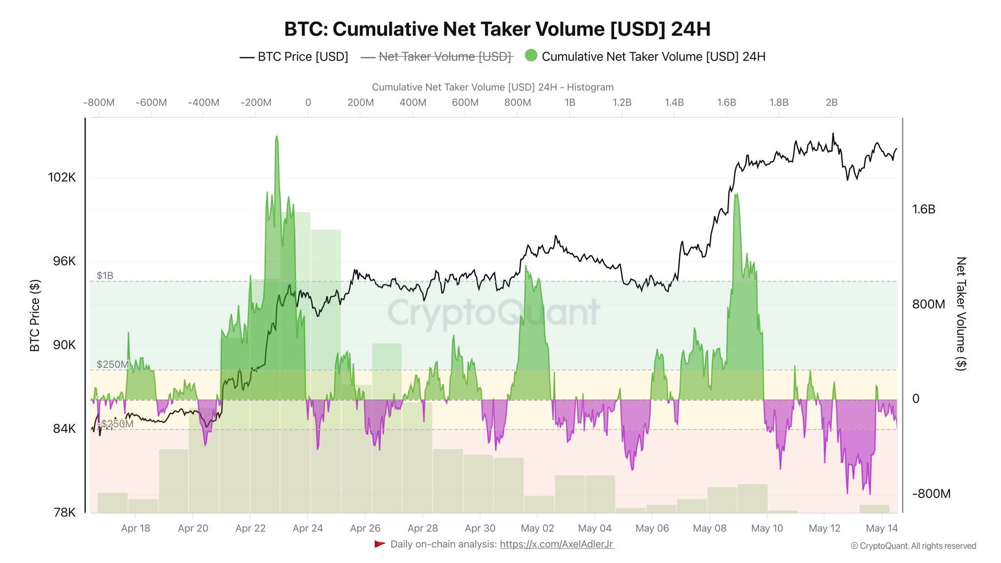 Согласно его посту на X, корень замедления, по -видимому, вытекает из рынка деривативов. В частности, он указал на совокупный объем чистого такера, метрику, которая отслеживает чистый объем рыночных заказов, оставаясь на отрицательной территории с тех пор, как BTC пересек психологический порог в 100 000 долларов США.
