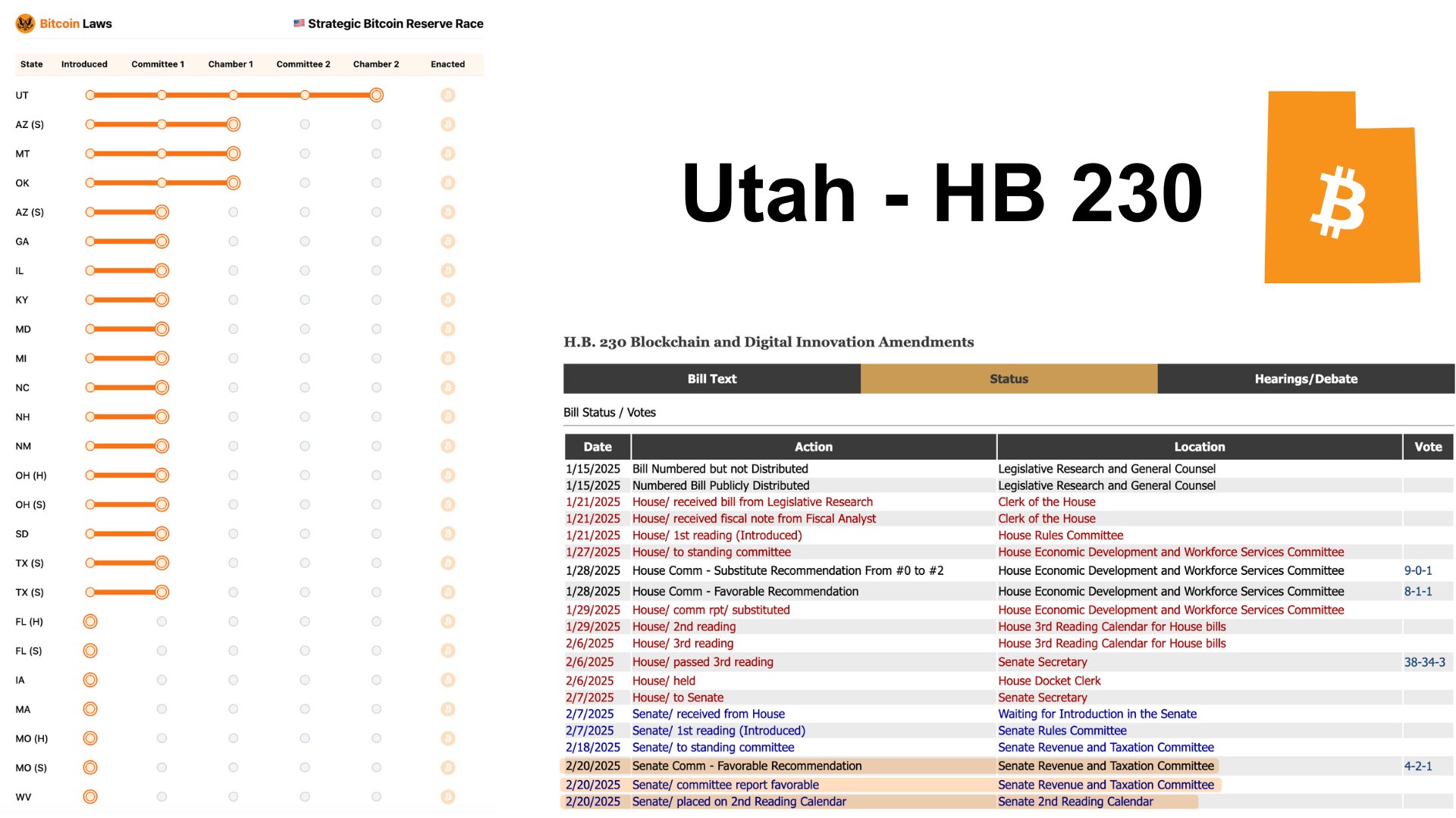 Законопроект HB230 «Блокчейн и цифровые поправки к инновациям» принял подкомитет по доходам и налогообложению в штате Юта в голосовании со счетом 4-2-1 20 февраля и в настоящее время направляется ко второму и третьему чтению до окончательного голосования в Сенате.