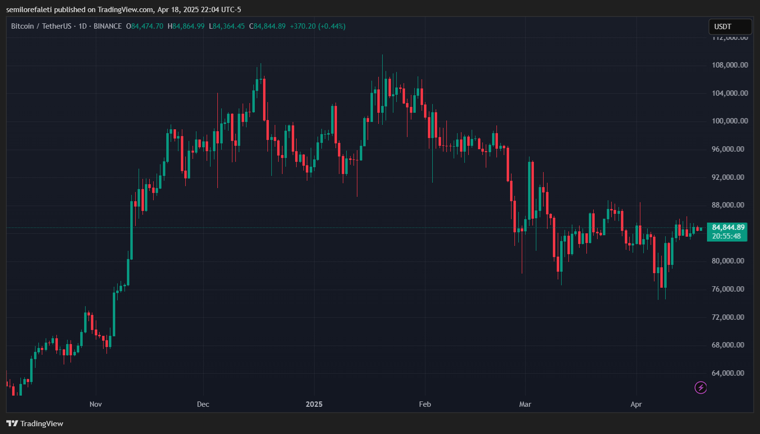 BTC Trading на уровне 84 844 долл. На ежедневном диаграмме |Источник: диаграмма BTCUSDT на TradingView.com