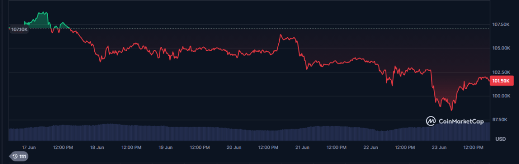 Биткоин кратко соскользнул до 98 974 долл. США поздно в воскресенье после того, как авиаудары США были предназначены для иранских ядерных объектов. Это был его самый слабый момент с начала мая.
