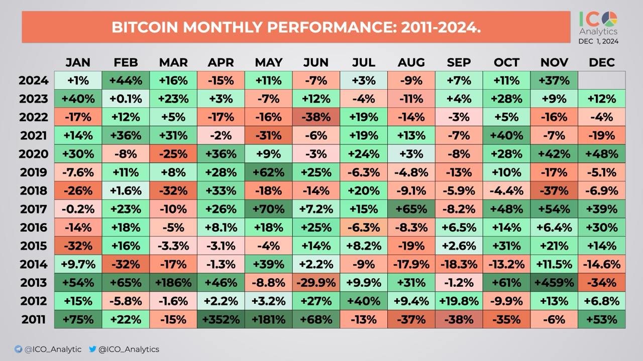 Согласно данным ICO Analytics, биткоин также продемонстрировал прирост на 37% в ноябре 2024 года. Данные ICO Analytics измеряли ежемесячную производительность Биткоин в период с 2011 по 2024 год и выявили только три других года, когда биткоин продемонстрировал более высокий процентный прирост в ноябре.