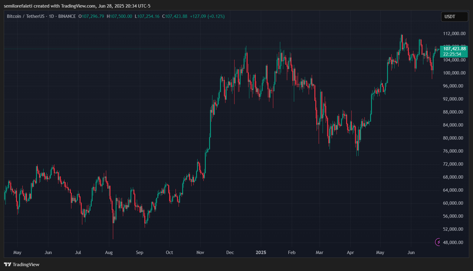 БиткоинBTC Trading на уровне 107 423 долл. США на ежедневную диаграмму |Источник: диаграмма BTCUSDT на TradingView.com