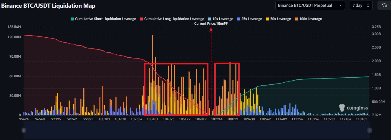 За прошедшую неделю цены на биткоин выросли на 5,07%, чтобы достичь местного пика в 108 000 долларов, прежде чем испытать твердый отказ. С тех пор ведущая криптовалюта осталась в диапазоне от 106 000 до 107 000 долл. США, не показывающих никаких признаков прорыва в любом направлении рынка. Среди этой консолидации рынка известный аналитик по криптовалюте с x username killaxbt выделил ключевые зоны ликвидации в нынешней структуре рынка Биткоин, которые имеют решающее значение для следующего значительного движения цен.