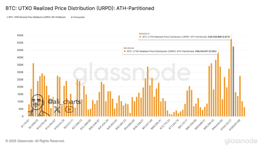 Несмотря на бычий технический фон, другие рыночные сигналы мигают предупреждения о биткоин. Примечательно, что аналитик Али Мартинес определил 104 124 долл. США в качестве важного уровня поддержки для Биткоин. Эта цена не просто произвольная, так как представляет собой тяжелую концентрацию реализованных цен UTXO.