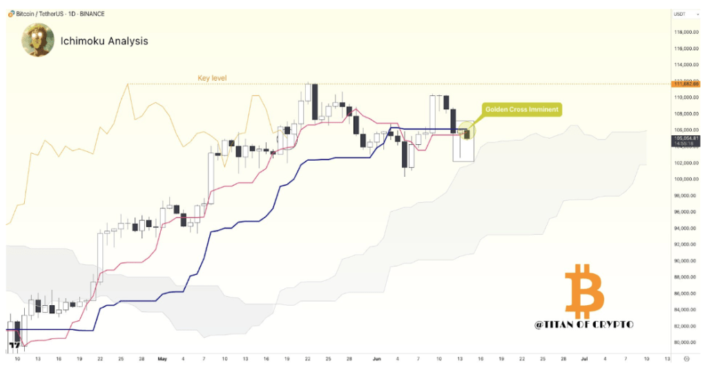 Интересно, что, как видно из ежедневной диаграммы Ichimoku, разделяемой аналитиком Titan of Crypto, Биткоин в настоящее время находится на грани подтверждения золотого креста, который является бычьим сигналом, в ближайшие дни.