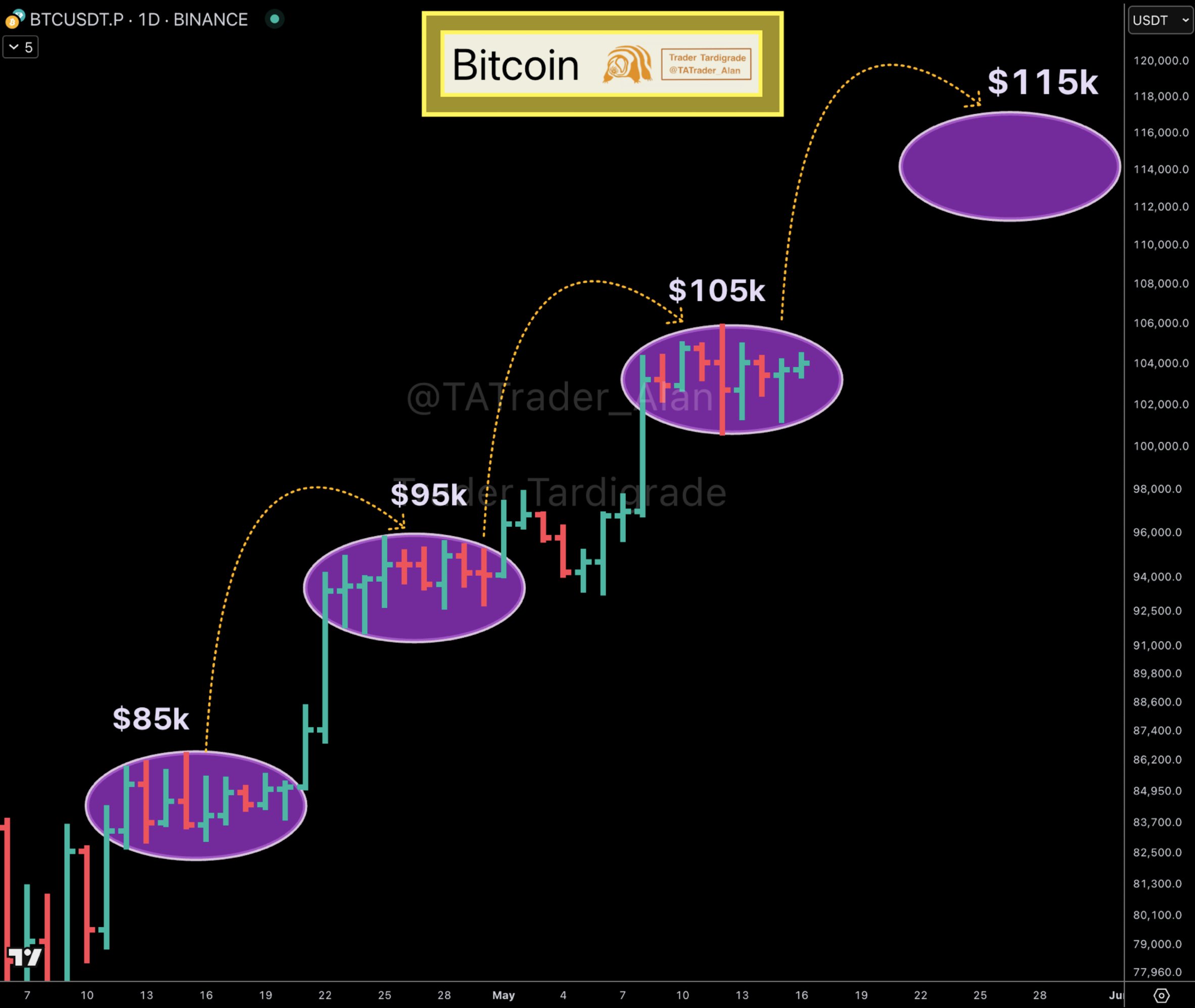 Среди расширенной коррекции на рынке криптовалют в 2025 году цены на биткоин в середине апреля в середине апреля разбились с 109 000 долларов США до менее чем 75 000 долларов. С тех пор, как в прошлом месяце в прошлом месяце была достигнула локальное дно в 74 600 долларов, в первой криптовалюте зафиксировала впечатляющий отскок рынка, что увеличилось на 39,1%, достигнув местного пика в 105 800 долларов. В сообщении X 16 мая трейдер Алан предоставил интересное техническое понимание этого восходящего тренда, подчеркивая, что биткоин неоднократно приводил к тому же скачке в долларовой стоимости, разделенном периодом консолидации. Торговая карта из аналитика объясняет, что, когда биткоин увеличивается примерно на 10 000 долл. США, он входит в период 7-10 боковой консолидации, прежде чем возобновить его восхождение.