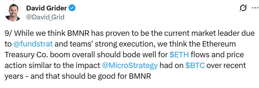 Тем временем Дэвид Гридер, партнер в фирменной фирме венчурного капитала, сказал в понедельник в посте X, что эфирная казначейская компания «Бум должен хорошо судить для потоков ETH и ценовых действий, аналогичных Impact MicroStrategy на биткоин», что должно быть полезно для битмина.
