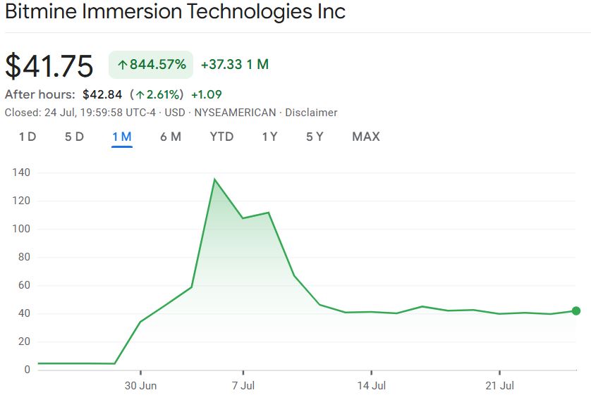 Через несколько дней после объявления о своих планах покупать эфир, битмийновая акция (BMNR) взлетели более чем на 3000% до рекордного максимума в 135 долларов 3 июля.