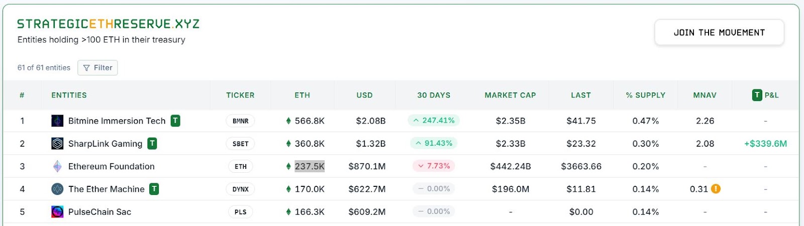 Стратегические эфирные резервы показывают битмин в качестве крупнейшей казначейской фирмы Ether, за которой следуют игры Sharplink с приблизительно 360 800 ETH и Фондом Ethereum, который состоит из 237 500 ETH.