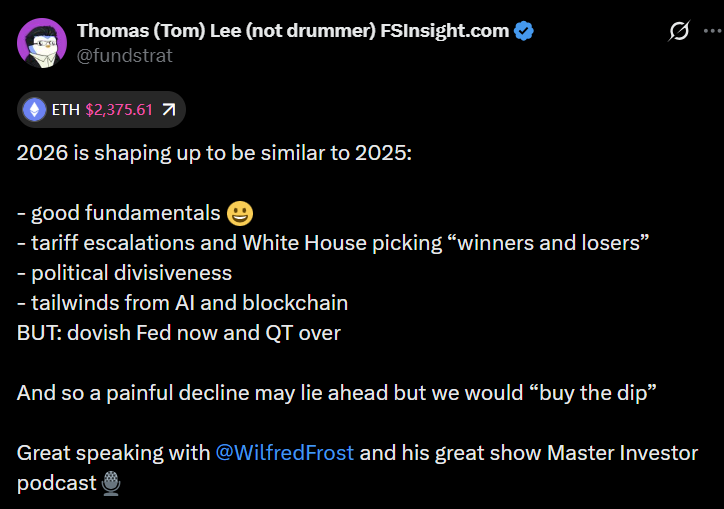 Несмотря на прежний оптимизм относительно конца 2025 года, Том Ли предупредил, что условия изменились: 2026 год, скорее всего, начнется на «болезненной» ноте, а затем в этом году произойдет потенциальное восстановление.