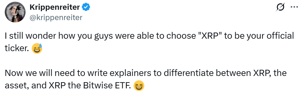 Пользователь X Krippenreiter, самопровозглашенный техник и преподаватель DeFi, спросил, как именно они «смогли выбрать XRP в качестве вашего официального тикера. Теперь нам нужно будет написать объяснительные, чтобы различать XRP, актив, и XRP, или Bitwise ETF».
