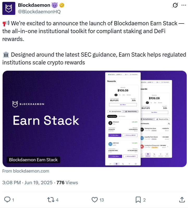 Поставщик институциональной инфраструктуры блокчейна Blockdaemon объявил о запуске своего децентрализованного финанса (DEFI) и STAKIKER Service, зарабатывает Stack.