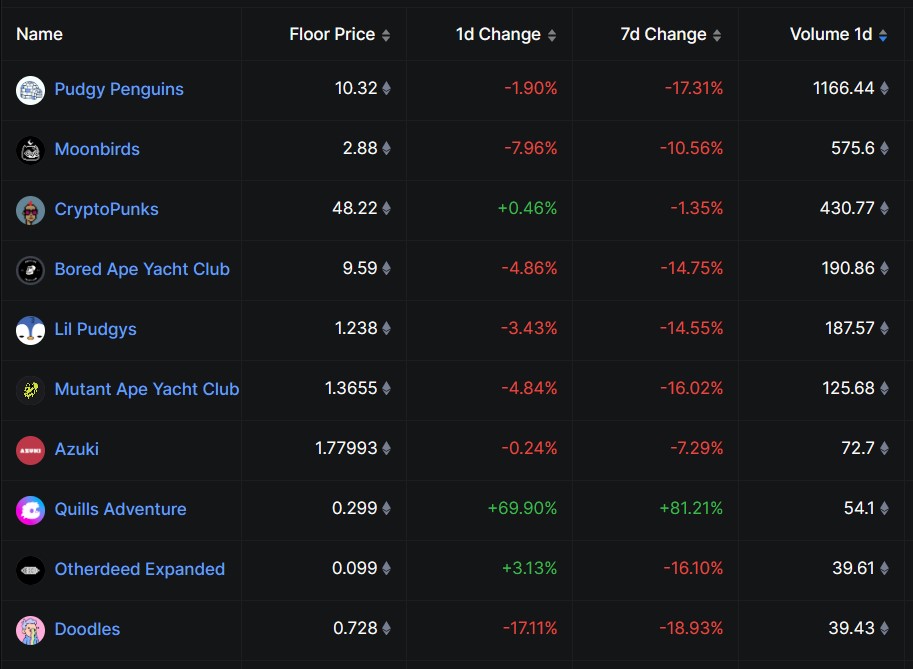 Pudgy Penguins, лучшая коллекция NFT на 24-часовой и 7-дневную объем, составила на 17,3% падение до 10,32 цены на этаж эфира (ETH). BAYC пролил от 14,7% до 9,59 ETH, в то время как Doodles зафиксировал одну из самых острых исправлений, упав на 18,9% до 0,73 ETH. Другие основные коллекции, такие как лунные птицы и Lil Pudgys, упали на 10,5% и 14,6% соответственно.