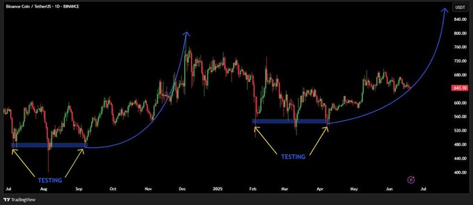 Для наблюдателя за рынком, «даже с рыночной неопределенностью, структура BNB чиста после уважения к линии тренда и отскочила от основной поддержки, теперь смотрящей на прорыв выше 700 долларов», что может быть частью более крупного движения к уровню 800 долларов.