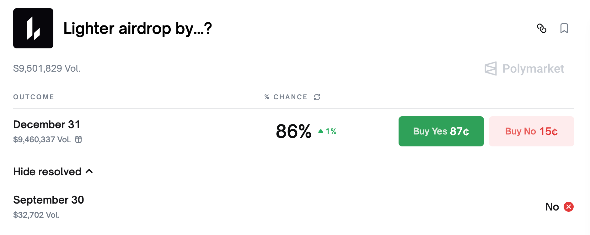 Lighter, бессрочная децентрализованная биржа (perp DEX) и главный конкурент Hyperliquid, подогревает спекуляции по поводу airdrop, поскольку трейдеры Polymarket делают ставку на запуск токена до конца года.