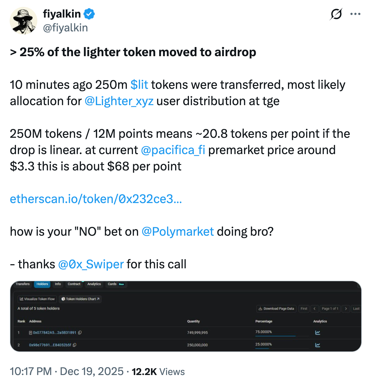 Аналитик Onchain Эндрю 10 GWEI ранее предполагал, что раздача произойдет к концу декабря, используя предполагаемое доказательство инсайдерской ставки на Polymarket.