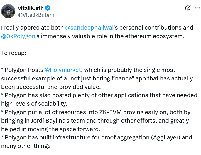 Позже его сообщение вызвало реакцию соучредителя Ethereum Виталика Бутерина, который отметил достижения Polygon в более широком сообществе Ethereum.