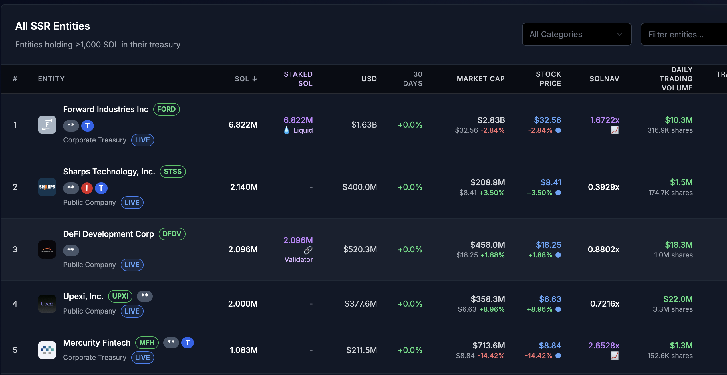 Ведущая ставка является форвардной промышленностью, удерживая 6,82 млн. Сола на сумму около 1,63 млрд. Долл. США по текущим ценам, за которым следует технология SHARPS с 2,14 млн. Sol и Defi Development Corp с 2,10 млн. Sol.